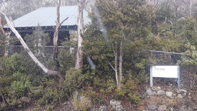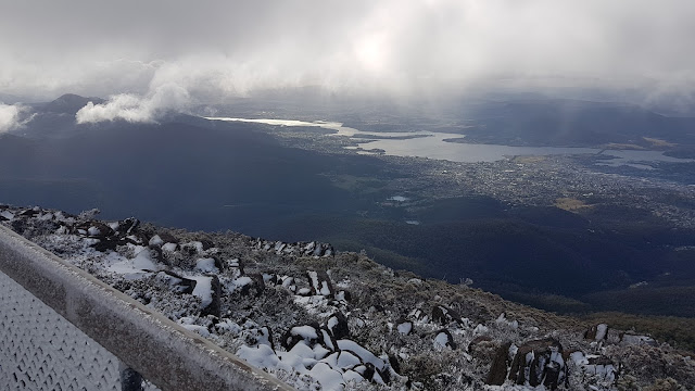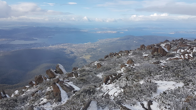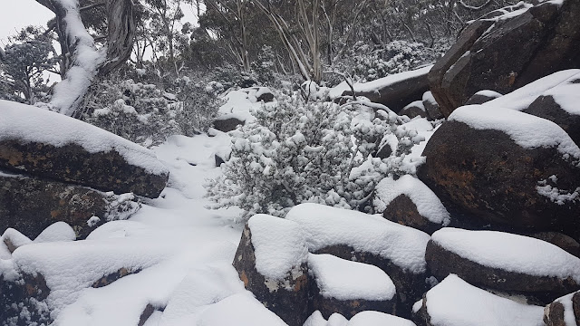 On Wednesday fresh snow bedecked kunanyi / Mount Wellington making a spectacular sight from our back yard. Late morning I headed out on the usual back yard loop. After crossing the Clapper I turned right and headed uphill. Light sleet greeted me just after the sandstone outcrops on Old Hobartians and a full-on snow flurry greeted me at The Chalet marking 1,000 metres above sea level.