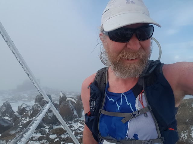 At the summit I paid the obligatory visit to the trig point and, in the complete absence of other people, I also jogged out to each of the lookout points. With a keen breeze blowing over the top and the mercury hovering around -2°C it was not time to linger so I scooted back down and completed the remainder of the back yard loop followed with the usual warm-down stroll up the hill to home.