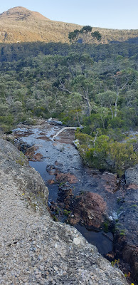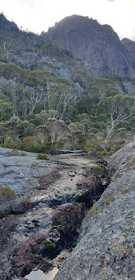 The Little Horn detour took an hour and a further hour delivered us down the hill past the unusually dry Artists Pool and Flynns Tarn cascades to arrive at Scott Kilvert Hut at 7:30pm. With Waterfall Valley Hut being reconstructed Overland Track walkers were being detoured to Lake Rodway for their first night so the hut and tent platforms were all full. We backtracked a little to pitch our tent on flat, glacially scoured bedrock – that’s what I call a hardened tent site.