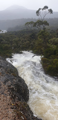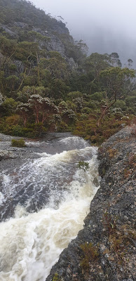 As a rainy evening turned into a rainy night and rainy morning the roar of the stream tumbling from Flynns Tarn down to Lake Rodway steadily grew. By the time it was light the stream was a raging torrent. From a 7:15am start we made a morning tea stop in the Little Horn Emergency Shelter at 8:30 and were ready for the shuttle bus at 10:00. Along the way it was amazing to see the before and after effect of the downpour. Waterfalls were pumping all over, especially above Flynns Tarn and Lake Wilks.