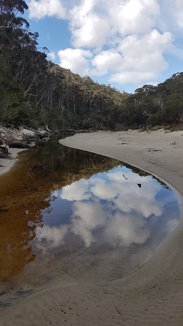 In contrast with its name, Stinking Bay was looking particularly idyllic last week with sun glistening on the crystal clear aqua waters and white sand. Pied oystercatchers patrolled back and forth while the broody lagoon of Gathercoles Creek and the surrounding tall eucalypt forests completed the picture. On several of my coastal runs nearby I’ve come across dead seals or whales so it’s not hard to imagine how the uncomplimentary name was originally conceived.