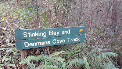 The walk (jog in this case) starts by following the old road 750m up a gentle rise, passing a small dam along the way. A sign then indicates the start of the single trail which descends 600m (distance, not altitude!) through wet stringy bark and blue gum forest to the shore. The trail swings NE for 650m to arrive at Stinking Bay beach.