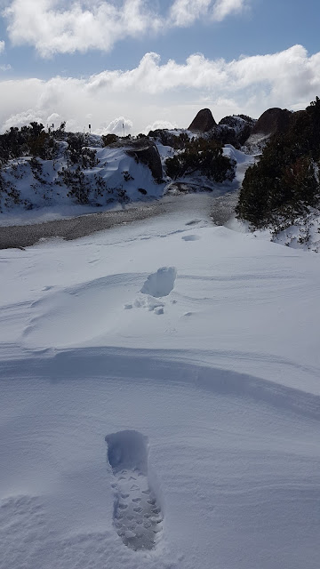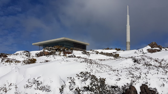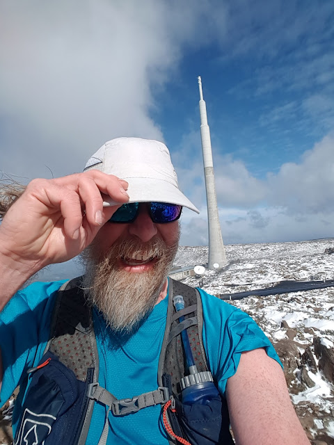 A particularly nasty snow shower had greeted one of my trail running mates for his arrival at the summit a little earlier as I was battling my way up the road between The Chalet and Panorama Track in relative shelter. Timing was on my side as blue sky and sunshine accompanied the icy winds for my brief summit visit. Running down the road from the summit invoked a strange, euphoric feeling as the freezing conditions on my exposed skin contrasted dramatically with my core which still felt toasty from the uphill slog.