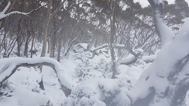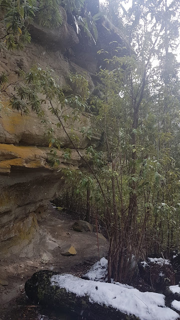 I hit the track at 1:40pm and struck falling snow only one kilometre up the track. In the second kilometre I crossed the North-South Track and encountered my first settled snow just before reaching the sandstone overhangs. By the time I reached The Chalet it was snowing heavily. A snow plough headed past and only 5 minutes later the black road surface revealed in its wake was once again blanketed white.