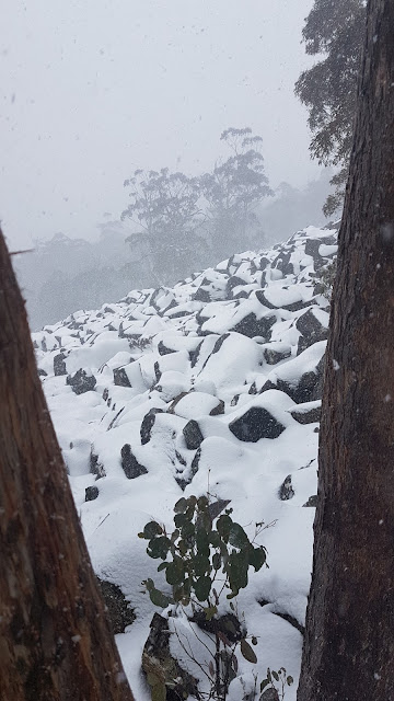 Falling snow followed me all the way back to the car in Lenah Valley. When I got home my son, Henry, concurred after seeing snow fall on the windscreen of his school bus as it trundled along Augusta Road at the same time. Later in the afternoon I discovered Kylie had woken that morning to a dusting of snow on the tents of her Three Capes school trip at Cape Raoul. At Tasmania’s moderate latitude low level snow has always been and will continue to be a novelty!