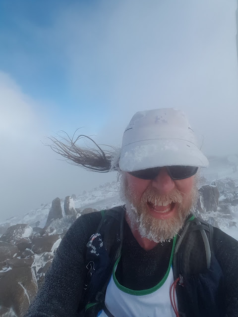 At the summit the obligatory selfie revealed I had developed beard icicles in the brief time it took me to negotiate the car park and pinnacle path. It also revealed my hair made an effective anenometer which clearly indicated the winds were easily gale force.