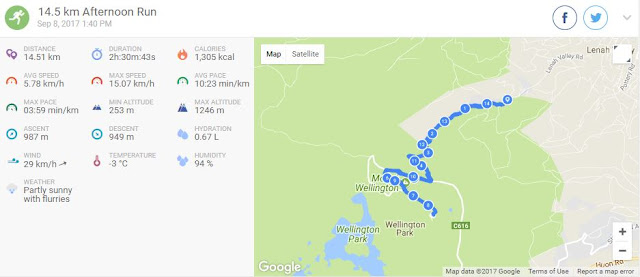 In February Kylie and I tackled the summit run via this route and, for a change, ran separately to see how we would go. At 2:04:37 it was my fastest trip up and back by far. At the summit (half way by distance) I was approximately one kilometre or five minutes ahead of Kylie. However, as her finishing time of 2:05:18 proves, she a fast descender. In the last kilometre I passed a couple of walkers. Much to my surprise a few seconds later I heard Kylie greet the same walkers. She had no idea I was just in front. I was therefore able to so a cheeky sprint to the line and maintain my 41 second ‘winning’ margin. (Not that it was a race!)