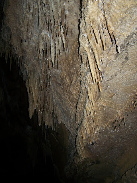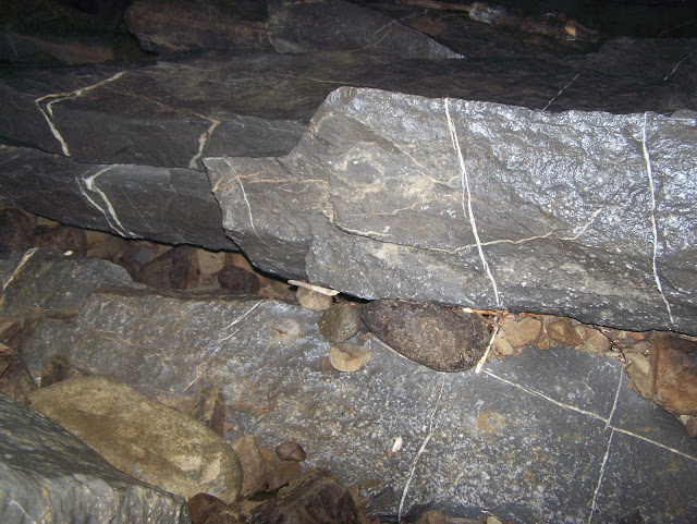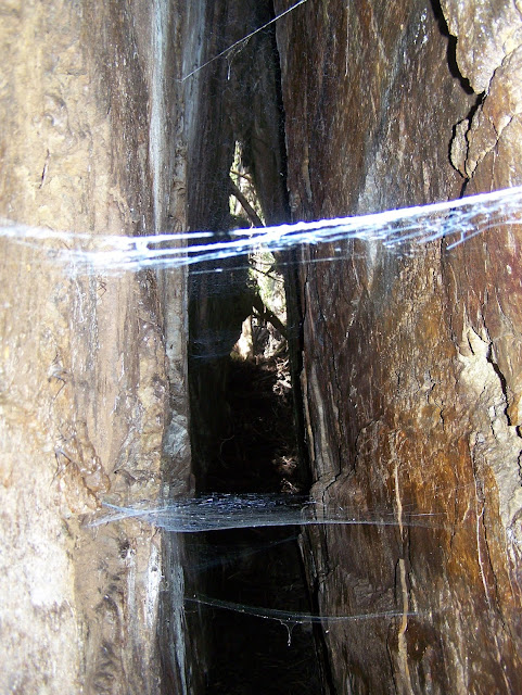 | Flash photo from inside slot cave high above Mystery Creek quarry looking out toward daylight |