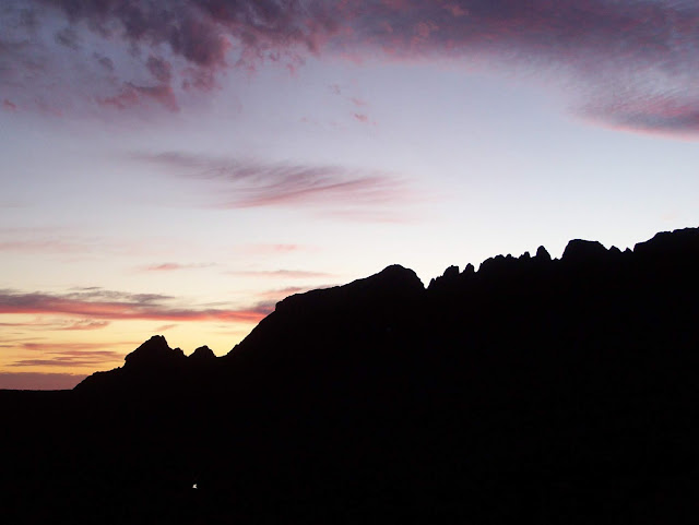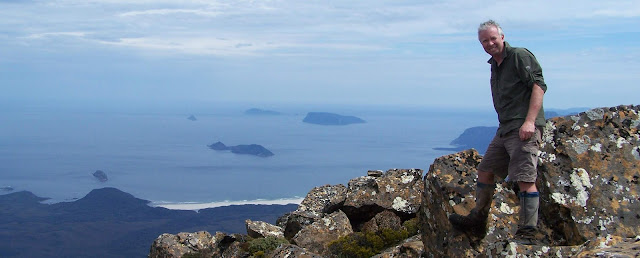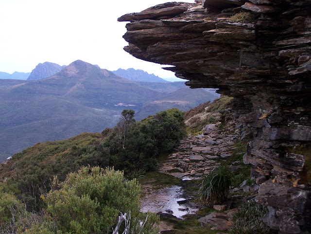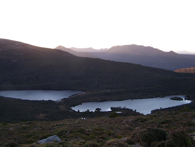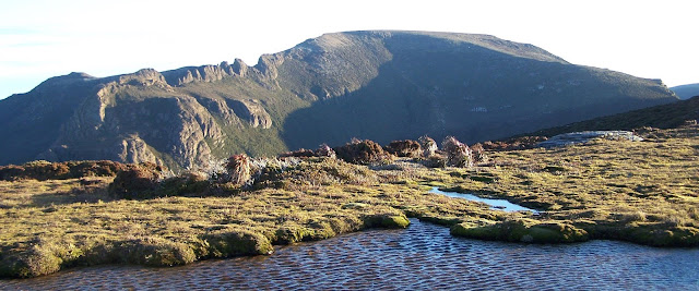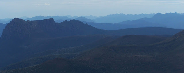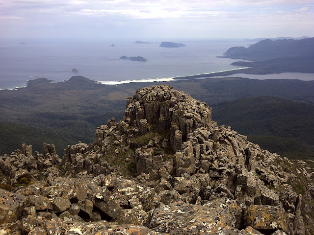 After being treated to an amazing sunrise over the Hippo and Cockscomb I headed off with a light pack for some peak bagging. By 7am I was admiring the spectacular summit cairn atop Mount La Perouse. Clear conditions and the broad, scrub-free summit encouraged me to take a circuitous route back to the main track.
