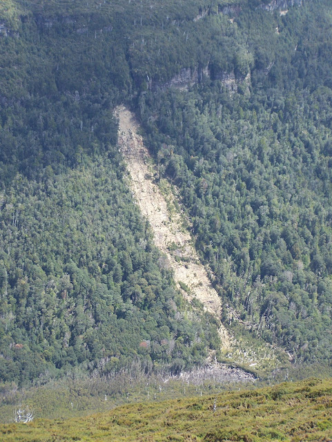 As I retraced my steps over Hills Four, Three, Two and One then back down to the car a few things caught my attention. Firstly, the view of Arndell Falls from Hill Four was quite distracting – was my scrubby mission worthwhile after all? Secondly, there’s a ripper landslide below Hill One where the steep, glacially carved valley has collapsed sending enough rubble into the Lune River to create a temporary dam which must have filled enough at some stage to kill the trees upstream. My final distraction on the way out was a narrow slot cave in the forest just as the track starts its final descent into the eucalypts above Mystery Creek – I suspect this is the uppermost karst feature in the area.