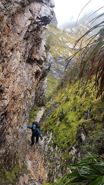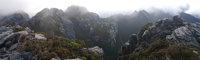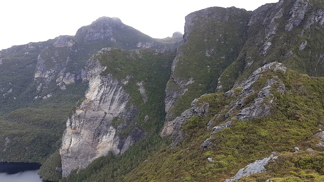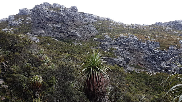 From camp the first couple of ‘bumps’ are quickly engaged. Relatively easy ascents, descents and sidles soon lead to the appropriately named Tilted Chasm. A lively, steep descent through the chasm leads into one of many arduous patches of dwarf forest which speckle the mid-sections of the range before yet another sidle and ascent leads to The Dragon. Along the way we speculated as to how this feature got its name. The many contorted rock patterns in the area could potentially look like a fire-breathing, winged beast.