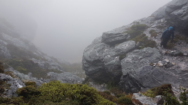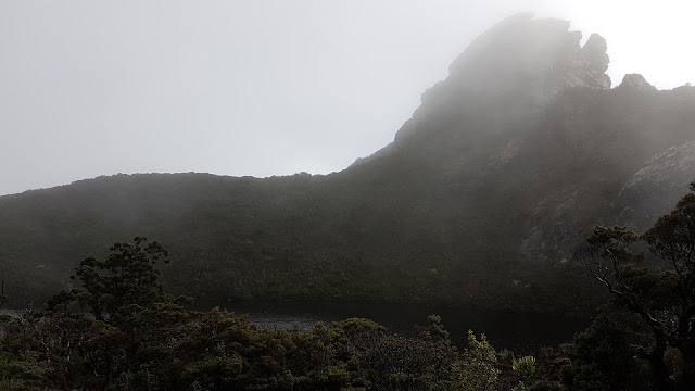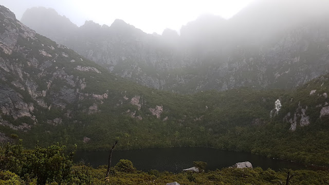 Lake Sirona had a navigational challenge in store. By now the rain had been replaced by thick fog. The trail appeared to suddenly plunge into a bottomless abyss right where I thought we should be approaching the lake which, according to the map, was a mere 50 metres below us. As Kylie climbed confidently down I looked at the map, studied the notes and reluctantly followed, worried we may be launching ourselves off the edge of the range. Within moments the truth was revealed. The sullen surface of the lake was blending perfectly with the surrounding mist making it invisible from the low ridge above. The descent took less time than I had spent contemplating the dilemma.