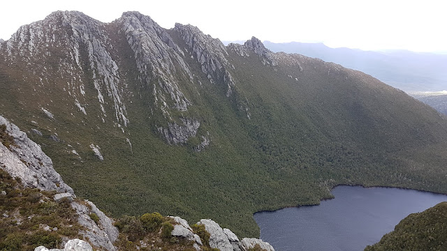 A rapid descent down Kappa Moraine then a more gradual descent past Lake Juno led us to Lake Vesta, our lowest point since ascending Alpha Moraine. An impressive waterfall linked the two lakes while the surrounding cliffs reached imposingly up into the clouds. This area featured dense regrowth following a relatively recent fire event. It was only then that I realised the rest of the traverse had a total lack of recent fire. The stunted forests along the range to this point had featured fire-sensitive, dwarfed, rainforest trees with an open understory. I now found myself frustrated at the dense undergrowth getting my shorts wet for the first time in the whole trip.