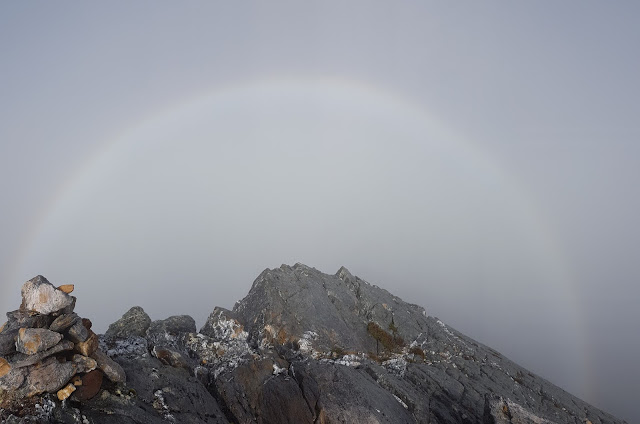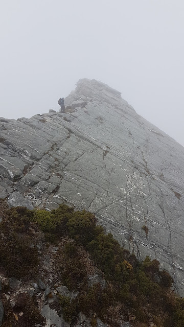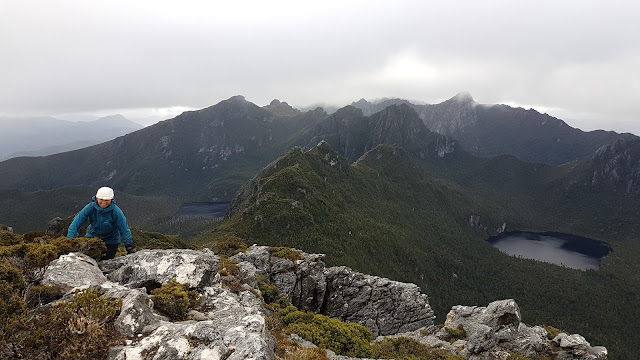 Beyond Lake Sirona easy walking led to the tilted pyramid of Mount Scorpio’s summit block. Kylie kindly posed where the main track perches precariously above steep sloping slabs. At the top the clouds would not part for a view but we did get a faint glory projected around us and the satisfaction of bagging another Abel.
