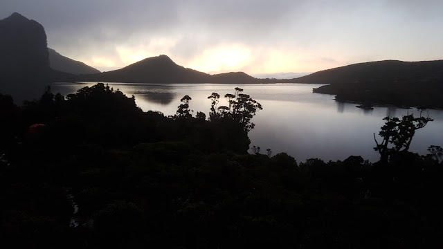 Once we arrived at the broad saddle marking the true end of Beggary Bumps we then had the relatively simple climb over Mount Taurus and down to the tent platforms at Haven Lake. With my overly optimistic assessment of our progress earlier in the day and my near death dangle my head was in a bad place as we approached the top of Mount Taurus. It took encouragement from Kylie before I made the five minute detour to claim my two peak baggers points. I can’t believe I almost passed it by. The view back along the Bumps was most satisfying and Aldebaran looked decidedly stately presiding over Lake Jupiter far below.