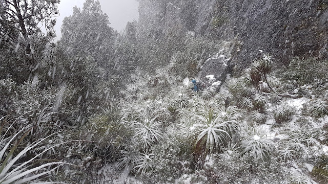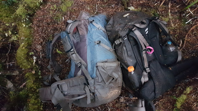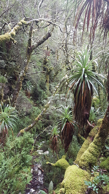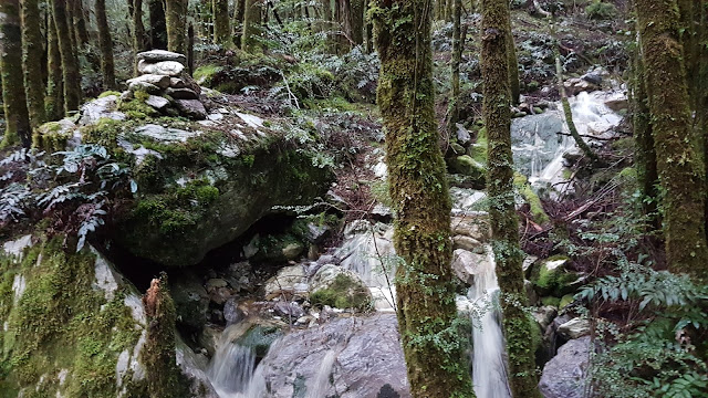 Keeping a safe distance from the lake shore the forest opened and, like a beacon in the night, a large cairn appeared beside a torrent tumbling down a steep, rocky bed. Hoping this was a marker for the long-awaited rock slide we headed up the northern side of the stream. As the terrain got steeper the scrub got thicker and we had to choose between splashing our way up what was beginning to look like a waterfall or move away from the stream and attempt to find more open climbing in the forest.