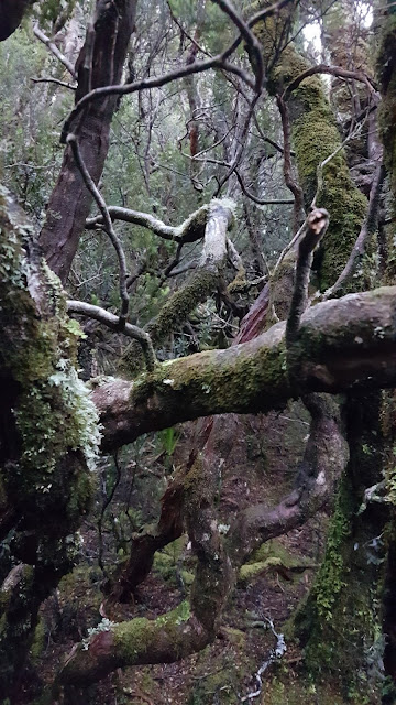 When the lake appeared through the dense forest there was no easy shoreline to traverse. The dense forest extended well beyond the shore. Walking anywhere near the lake meant ominous deep pools of jet black tannin stained water lurked beneath the mossy rotten tree trunks over which we scrambled. A watery plunge was the last thing we needed.