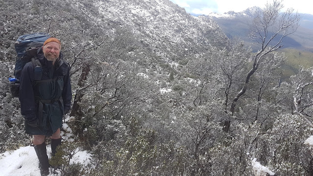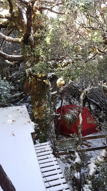 A nasty, densely scrubby and not-so-minimal-impact traverse to our left delivered us to what was a delightfully scrub free walk of two hundred metres around to the tent platforms at Upper Bechervaise Plateau. Right on dark, as we cleared snow to pitch the tent, at least some of our questions had been answered. The roaring stream was indeed the Rock Slide. We still do not know just how difficult it would have been climbing that route while a snow-melt-powered torrent took the same route in the opposite direction. Something to investigate another day. At least we were still on track with our goal to be home by mid afternoon on Day 12.