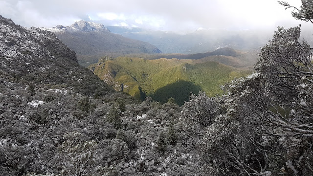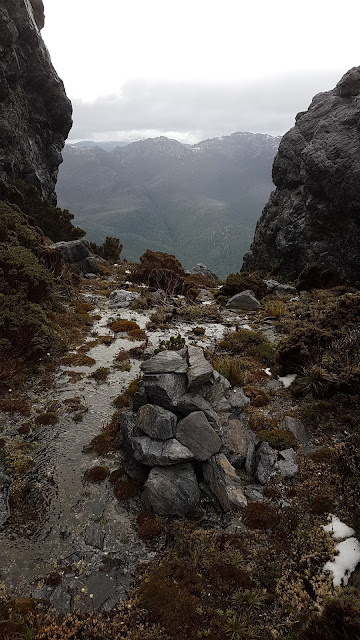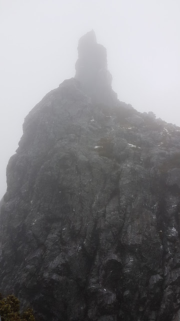 From Hanging Lake Junction traversing the fan-out section between us and Stegasaurus Ridge was no easy feat. The visibility was so poor that we could not see from one fan-out marker to the next. Eventually we located cairns indicating the path ahead. At the Stegasaurus high point of 1165 metres we were tantalisingly only 60 metres lower than Federation Peak itself but problems were about to set in. Soon after the high point the route traverses a large boulder above a cliff line which dropped into the swirling cloud between us and Lake Geeves. With much trepidation we traversed the ice and snow covered boulder only to find an even more daunting descent ahead. At this point we pulled the pin. After traversing back over the snowy boulder we took a few deep breaths then scooted back towards Thwaites Plateau.
