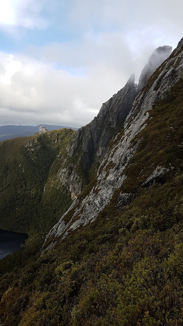 | Federation Peak from above the Forest Chute showing Lake Gaston, the Rock Slide and the cliffy forest on the left where we actually climbed up to Bechervaise Plateau |