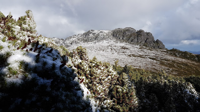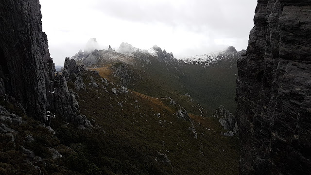 Right on cue a break in the clouds greeted us as we emerged at the end of Four Peaks. Thwaites Plateau, Devils Thumb and a broody Fedder emerged from the clouds. Renewed optimism spurred us through the mist on the gradual ascent over Thwaites and we arrived at the Hanging Lake turn-off right on midday. The snow and ice at the junction guaranteed a Federation Peak ascent would be out of the question. With children arriving at our place after school in little over 48 hours the question weighing heavily was, ‘How would we go on the Southern Traverse in these conditions?’