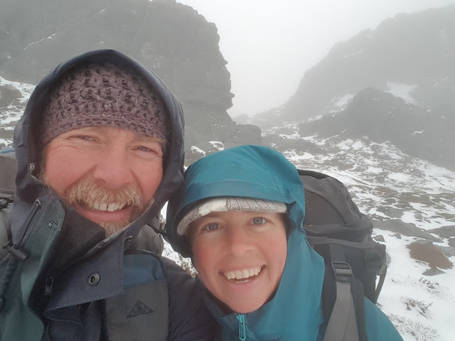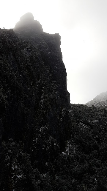 The day started with a bleak old trudge over the fan-out section of Goon Moor before a very well formed track led us on a curvy path through The Gables. Extremely limited visibility and cold conditions encouraged speedy progress through the Four Peaks. Seemingly vertical walls rising into the cloud all around us made it hard to imagine any way of collecting the multitude of peak bagging points to be gained in this area.