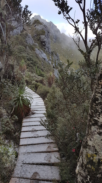 After much oooing, aaahhing and photo taking we continued. A track marker comically pointed straight down which seemed an apt description. Much to our surprise, superb trackwork including extensive duck-boarding made the steep descent a breeze.