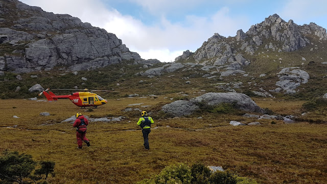 After the balmy night at the foot of Alpha Moraine our second night was more typical of South West Tasmania. Cold wind and intermittent showers made the morning’s chores a bracing affair. The sound of a helicopter accompanied our pack-up. It seemed to be hanging around the range. Perhaps a search. Hopefully just an exercise. As we hit the track the familiar red and yellow livery of a Westpac Rescue Helicopter passed overhead.