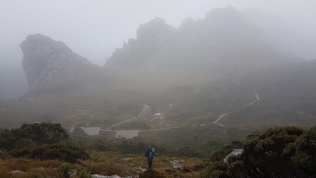 With the morning characterised by slow progress up Mount Pegasus the afternoon was a stark contrast with distance almost melting away until we approached High Moor. At 950 metres this is the highest formal campsite on the range. We arrived in thick fog accompanied by an eerie stillness which added a certain mystique. The tent platforms are delightfully sheltered to the south and west while being open to what must be amazing views, on a clear day, to the north and east. An ideal location to ponder tomorrow’s mission – the Beggary Bumps.