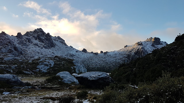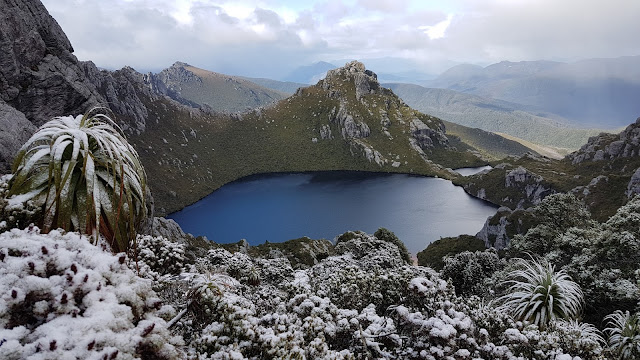 | Lake Oberon and Pegasus Minor with snow-dusted scoparia and pandanis. |
